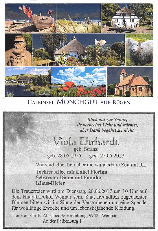 Die Trauerfeier findet am Dienstag, 20.6.2017, um 10.00 Uhr, auf dem Hauptfriedhof Weimar statt. Statt Blumen wird um Spenden für wohltätige Zwecke und um lebensbejahende Kleidung gebeten.