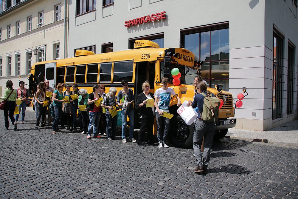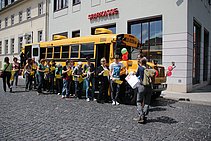 Er stieg an Bord des gelben, original amerikanischen Schulbusses zusammen mit Anja Pfotenhauer, die das Projekt Weimars gute Nachbarn koordiniert und mit vielen anderen Freiwilligen, um auf Stadtrundfahrt und Werbetour für freiwilliges Engagement zu gehen.