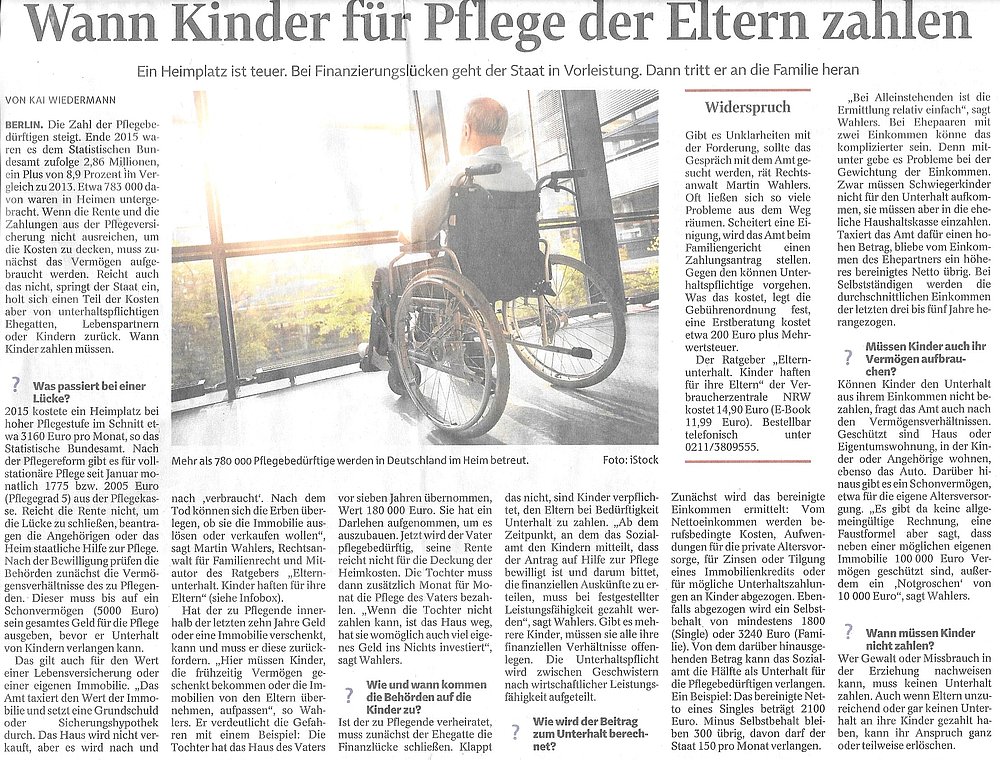 Wann müssen Kinder für die Pflege der Eltern bezahlen? Wie und wann kommen Behörden auf die Kinder zurück um Finanzierungslücken für Heimplätze zu schließen, wenn die Pflegeversicherung und Rente nicht ausreicht? Wie hoch ist das Schonvermögen, das nicht angetastet wird? Wann müssen Kinder nicht zahlen? Wie viel wird als Unterhalt angesetzt?All diese Fragen beleuchtet der eingescannte Artikel aus der TLZ vom 23.5.17.