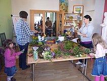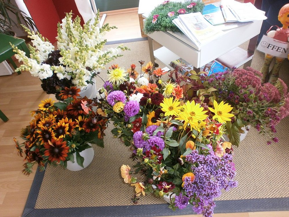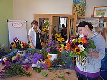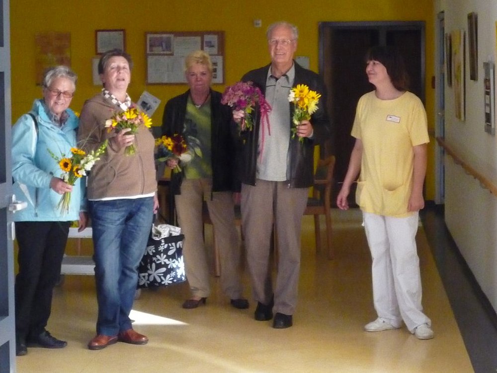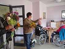 Dazu trafen sich die "Nachbarn", Koordinatorinnen Susann Schwenke und Viola Ehrhardt sowie 2 Floristinnen des Bildungszentrums Grone am 22.09.12 in der Bürgerstiftung, um gemeinsam Blumensträuße zu binden, die dann an Senioren im Pflegezentrum "Am Paradies" verschenkt wurden.