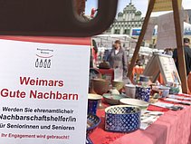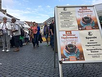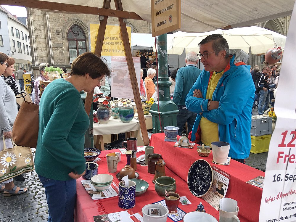 "(...) An rund 60 Ständen fand sich eine breite Palette an Keramik und Töpferwaren in unterschiedlichen Farben, Glasuren und Formen, von der Gebrauchskeraum bis zu dekorativen Stücken für Haus und Hof. "Mach Sie sich mit dem Kauf selbst eine Freude und tun Sie gleichzeitig Gues", empfahl Christian Wolff, Obermeister der Thüringer Töpferinnung, den Spendenstand nicht zu verpassen. Den Rat beherzigten viele: Der Erlös summiert sich auf stattliche 1026,80 Euro und geht an die Bürgerstiftung Weimar für das Projekt "Weimars Gute Nachbarn".