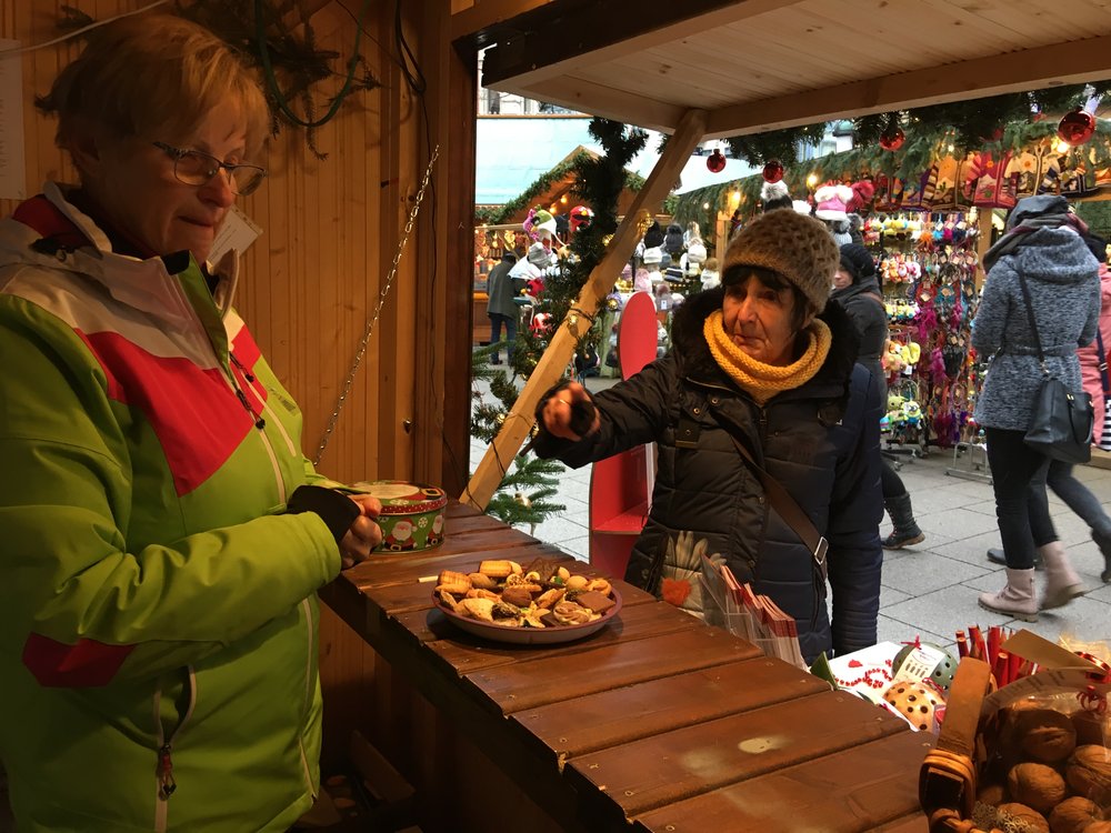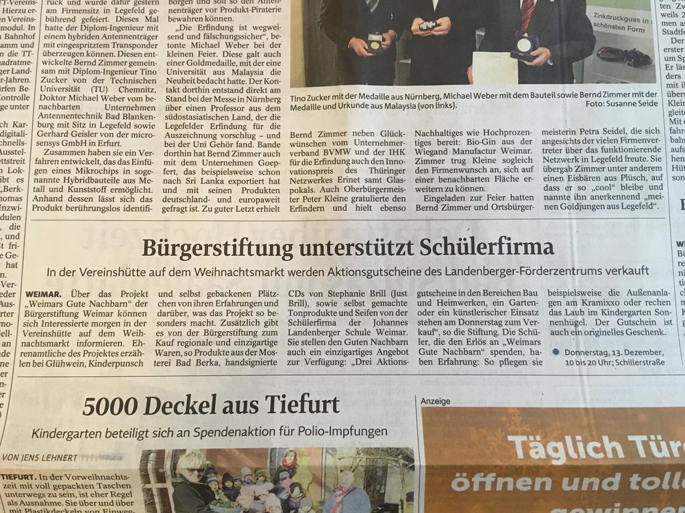 Es gab Glühwein und Kinderpunsch, tolle Produkte, wie z.B. selbsthergestellte Seife aus der Johannes Landenberger Schule oder Marmelade und Sirup aus der Mosterei Bad Berka. Und als ein ganz besonderes Angebot drei Aktionsgutscheine für je einen Arbeitseinsatz der Schülerfirma des Landenberger Förderzentrums, welche auch alle drei verkauft wurden! Der Erlös der Gutscheine ging als Spende an Weimars Gute Nachbarn.