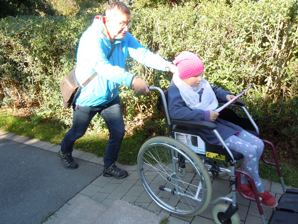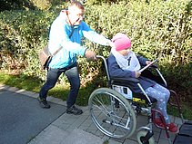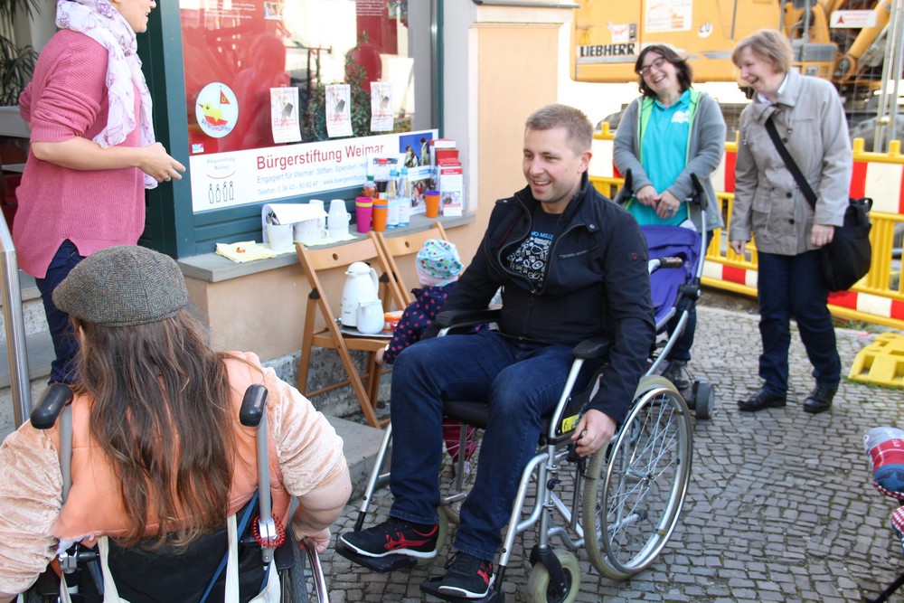 Unter den Freiwilligen: eine stadterprobte Rollstuhlfahrerin, ein Kleinkind im Buggy, zwei Rollstühle zum selber ausprobieren und zwei Gute Nachbarn.