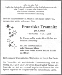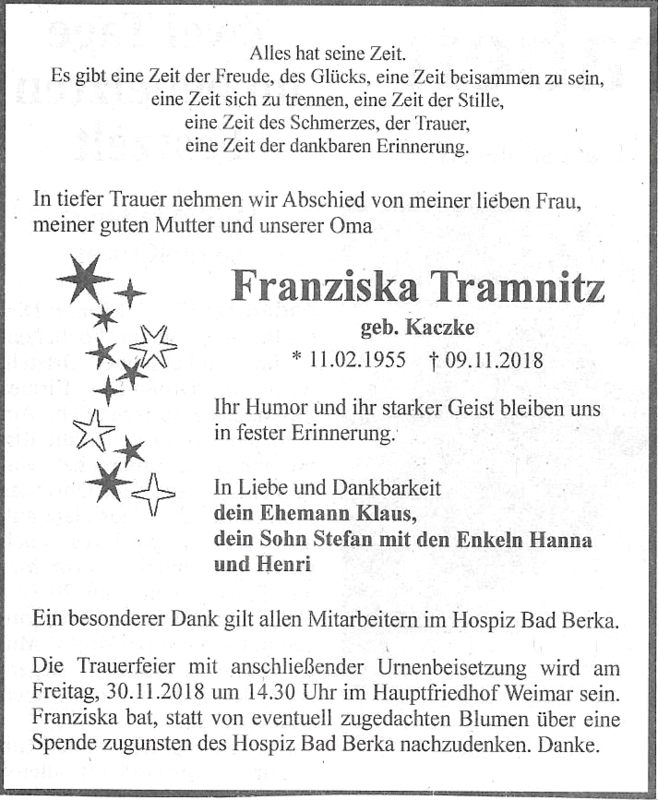 Die Trauerfeier für Franziska findet am 30.11.2018, um 14.30 Uhr auf dem Weimarer Hauptfriedhof statt. Sie wünscht sich statt Blumen Spenden für das Hospiz Bad Berka. http://www.hospiz-badberka.de/